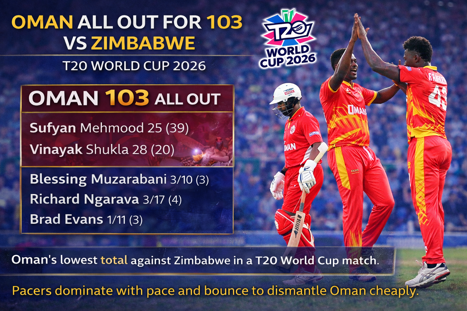 Oman struggled against Zimbabwe’s pace attack and were bowled out for just 103 runs. This is the lowest total scored against Zimbabwe in a T20 World Cup match.