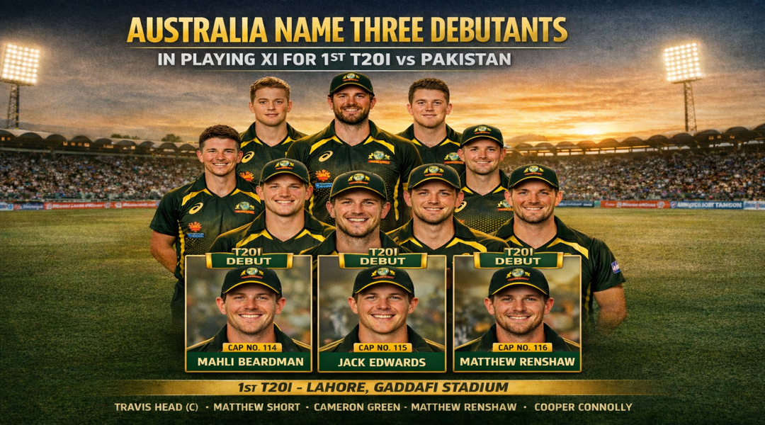 Australia has announced its playing XI for the first T20 International against Pakistan, with three players set to make their T20I debuts. Mahli Beardman, Jack Edwards, and Matthew Renshaw will feature in the series opener at Gaddafi Stadium, Lahore, scheduled to be played on Thursday.
