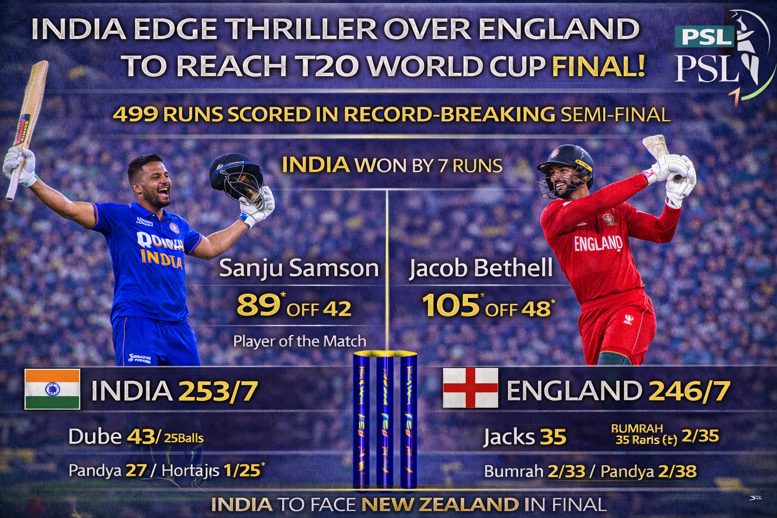 Sanju Samson was named the Player of the Match for his match winning 89, marking his second consecutive such award in the knockout stages. During the post match presentation, Suryakumar Yadav praised his team's resilience and described the atmosphere at the Wankhede as "unbelievable." For England, it was a valiant effort that saw them score the highest losing total in T20 World Cup history, but they ultimately could not overcome India's superior fielding and death bowling.
