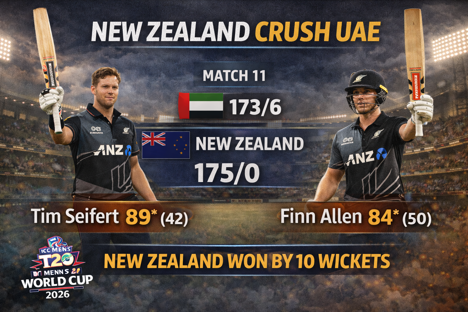 The end came with clinical efficiency in the 16th over. Tim Seifert finished the game in style, launching a massive six over long-off to remain unbeaten on 89 off 42 balls, featuring 8 fours and 6 sixes. Finn Allen remained not out at the other end on 84 off 50 balls. The 10-wicket victory with 28 balls to spare provided a massive boost to New Zealand's Net Run Rate, moving them closer to a guaranteed spot in the Super 8s.