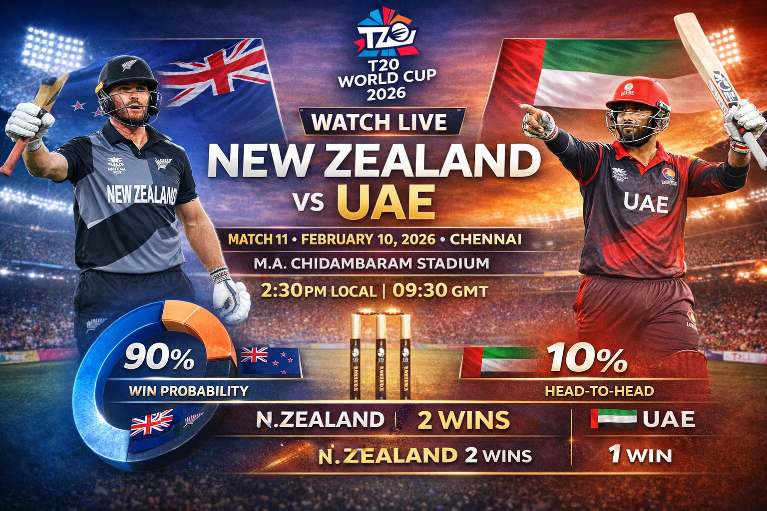 Chennai, February 10, 2026 New Zealand and the United Arab Emirates (UAE) meet in the 11th match of the ICC Men’s T20 World Cup 2026 at MA Chidambaram Stadium in Chennai. The match starts at 2:30 pm local time (09:30 GMT) with both teams looking for a key group stage win.
