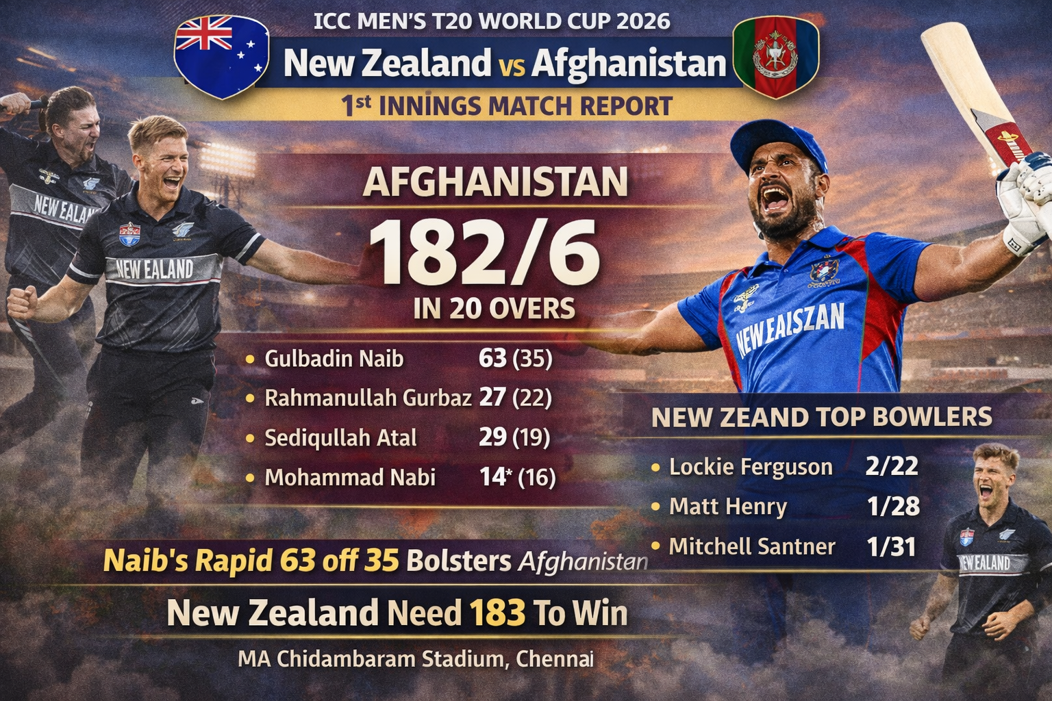 New Zealand vs Afghanistan – ICC Men’s T20 World Cup 2026: 1st Innings Match Report
