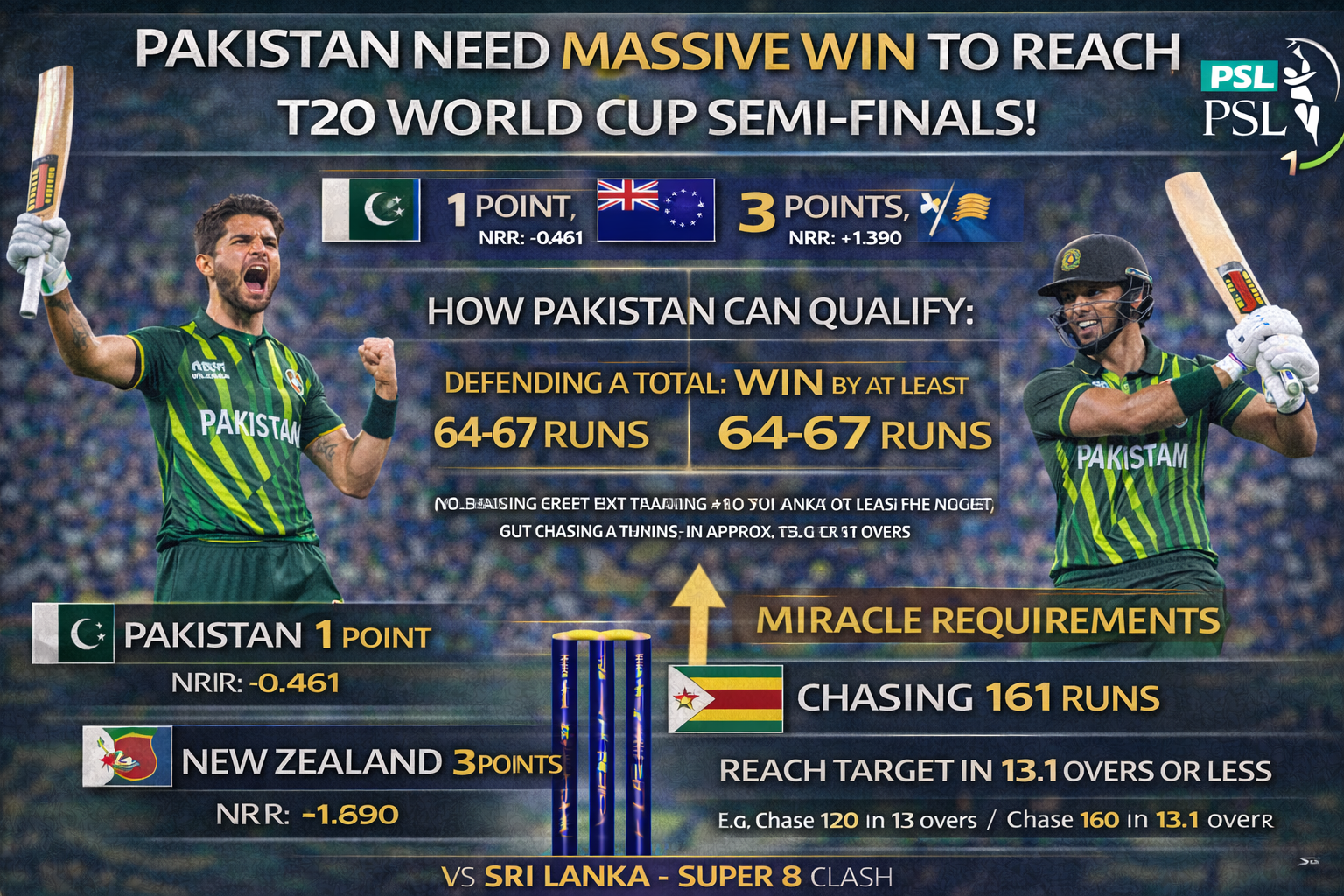 To secure a place in the semi-finals of the T20 World Cup 2026, Pakistan faces a daunting but mathematically possible task in their final Super 8 match against Sri Lanka. Following England's victory over New Zealand on February 27, the second spot in Group 2 is now a direct race between Pakistan and the Kiwis. New Zealand has finished their matches with 3 points and a Net Run Rate of +1.390. Since Pakistan currently sits on 1 point with a Net Run Rate of -0.461, a simple win is not enough; they must win by a massive margin to leapfrog New Zealand in the standings.