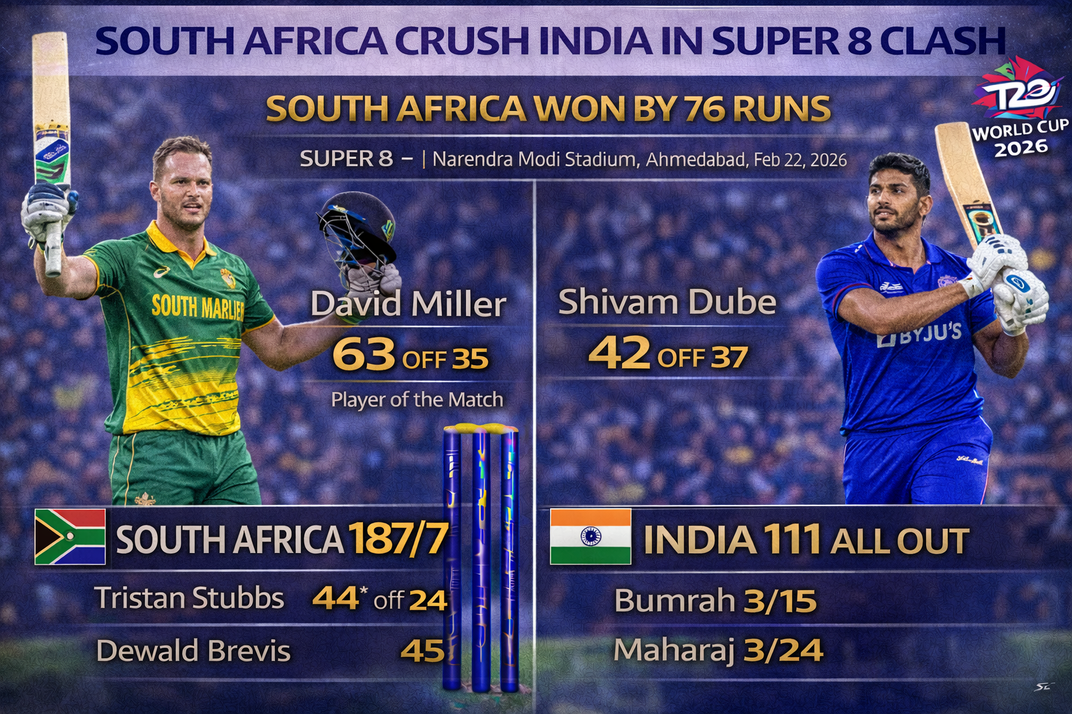 South Africa produced a clinical performance to defeat India by 76 runs in their opening Super 8 clash of the T20 World Cup 2026 at the Narendra Modi Stadium in Ahmedabad. In a high-voltage encounter on February 22, 2026, the Proteas successfully defended a formidable total of 187/7 by bowling out the Men in Blue for just 111 runs. This victory not only halted India’s unbeaten streak in the tournament but also provided South Africa with a massive boost to their Net Run Rate in the quest for a semi-final spot.