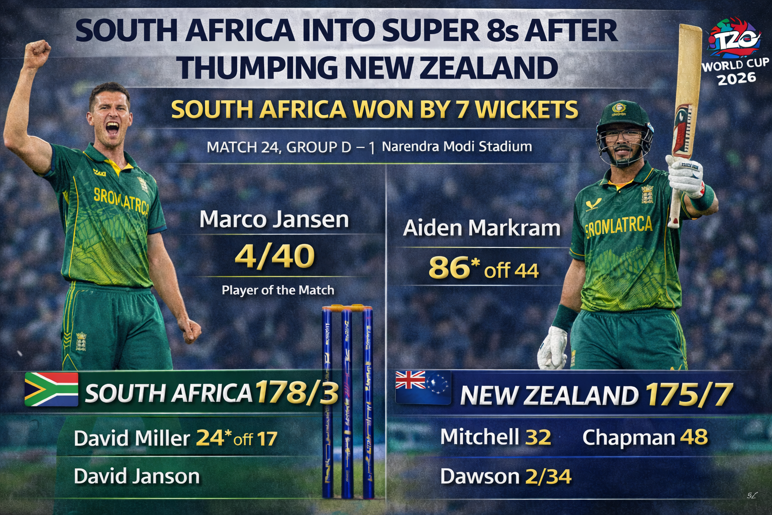 South Africa officially secured their place in the Super 8s of the T20 World Cup 2026 with a dominant 7-wicket victory over New Zealand at the Narendra Modi Stadium in Ahmedabad on February 14, 2026. In a battle between two of the top teams in Group D, the Proteas showcased a clinical all-round performance that combined disciplined bowling with a brutal batting assault. This win marked South Africa's third consecutive victory in the tournament, making them the first team to officially qualify for the next round.
