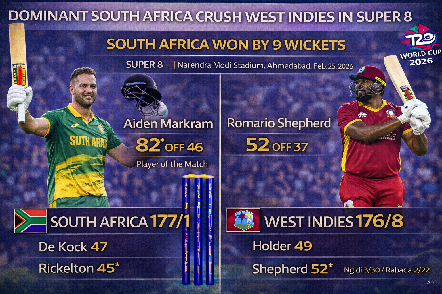 South Africa continued their relentless march through the T20 World Cup 2026, delivering a statement of intent with a crushing nine wicket victory over the West Indies in Match 47 of the Super 8 stage. Under the brilliant lights of the Narendra Modi Stadium in Ahmedabad, the Proteas extended their unbeaten streak to six matches, while simultaneously handing the Caribbean side a sobering reality check. Led by a masterful performance from their captain, South Africa chased down a target of 177 with ease, reaching the finish line in just 16.1 overs to practically secure their place in the semi finals.