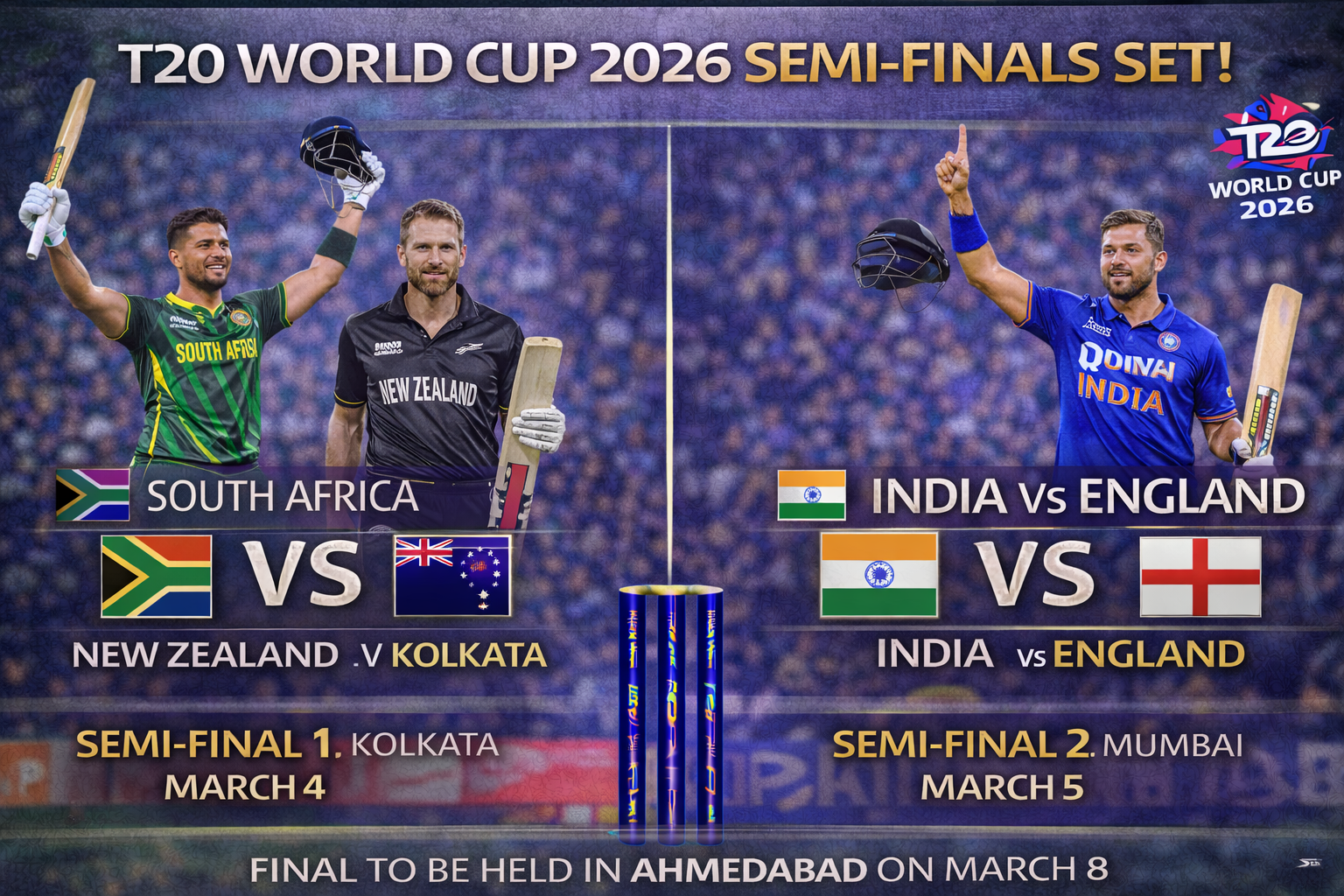 The semi final lineup for the T20 World Cup 2026 has been officially confirmed following a series of high stakes matches in the Super 8 stage. The four teams remaining in the hunt for the ultimate prize are South Africa, England, India, and New Zealand. These cricketing powerhouses have emerged from a grueling second round to set up two mouth watering clashes in Kolkata and Mumbai, with the final scheduled to take place in Ahmedabad on March 8, 2026.
