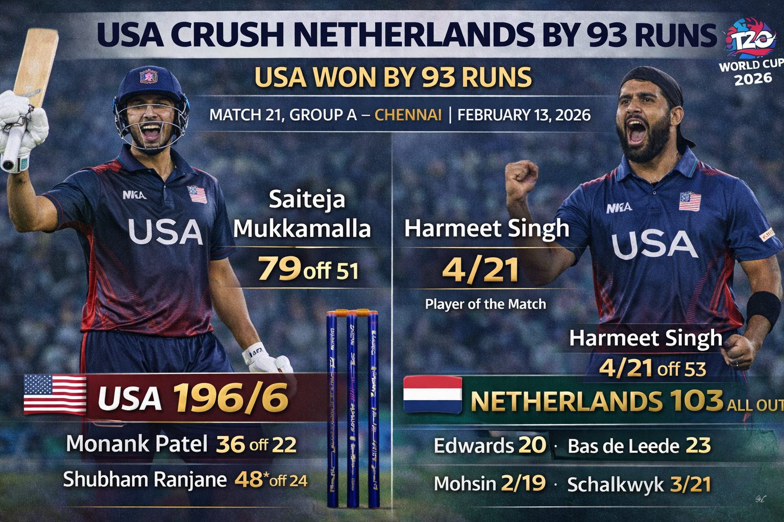 The United States of America produced a clinical and dominant performance at the M. A. Chidambaram Stadium in Chennai to secure their first-ever victory over the Netherlands in T20 international cricket. On a humid night on February 13, 2026, the American team kept their Super 8 dreams alive with a massive 93-run win in Match 21 of the T20 World Cup. It was a complete performance that saw a brilliant batting display followed by a masterclass in spin bowling on the famous Chepauk surface.