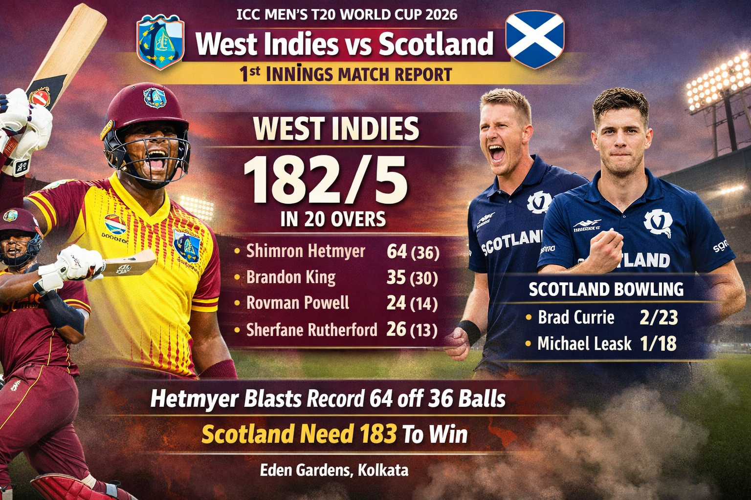 West Indies recovered strongly from a slow start to post a commanding 182 for 5 against Scotland at Eden Gardens, Kolkata. The innings was powered by a record-breaking knock from Shimron Hetmyer, who turned the match on its head with explosive hitting in the latter half.