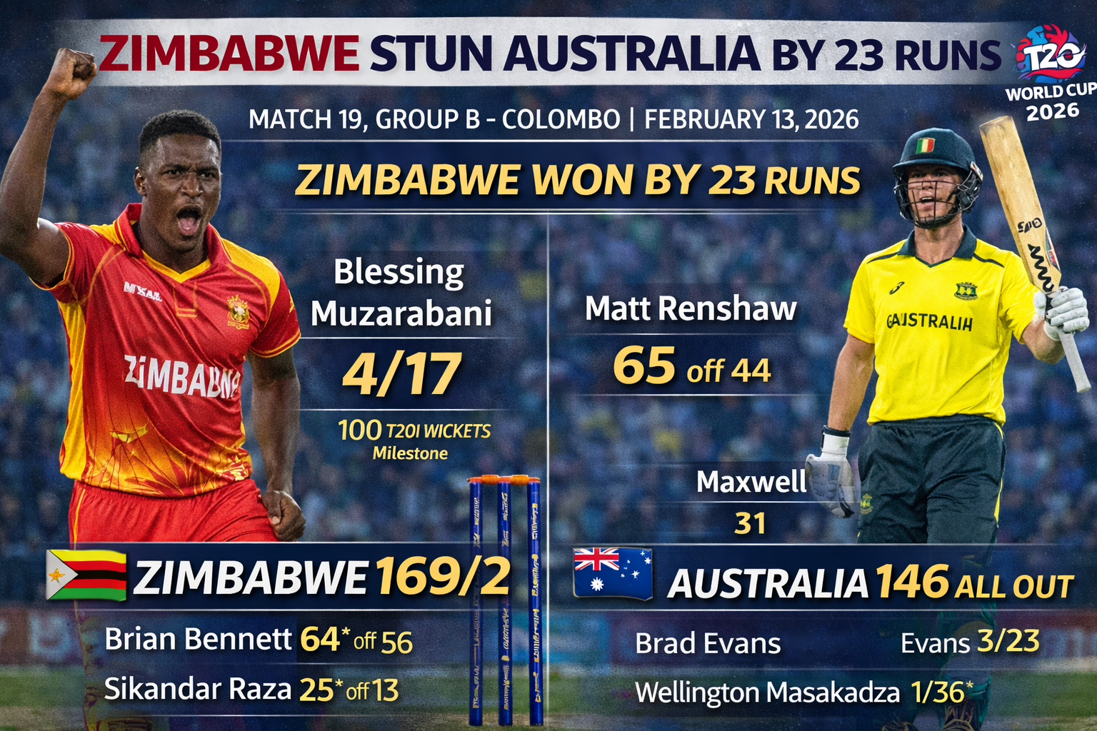 Zimbabwe produced the biggest shock of the 2026 T20 World Cup so far by defeating Australia by 23 runs at the R. Premadasa Stadium in Colombo on February 13, 2026. This historic victory in Match 19 marked the first time in 19 years that Zimbabwe had beaten the mighty Australians in a major global tournament. The "Chevrons" outplayed the former world champions in every department, proving that they are a force to be reckoned with in Group B.